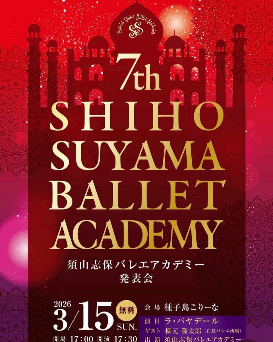 3月15日に種子島で開催される須山志保バレエアカデミー第7回発表会に白鳥バレエ柳元隆太郎がゲスト出演いたします。